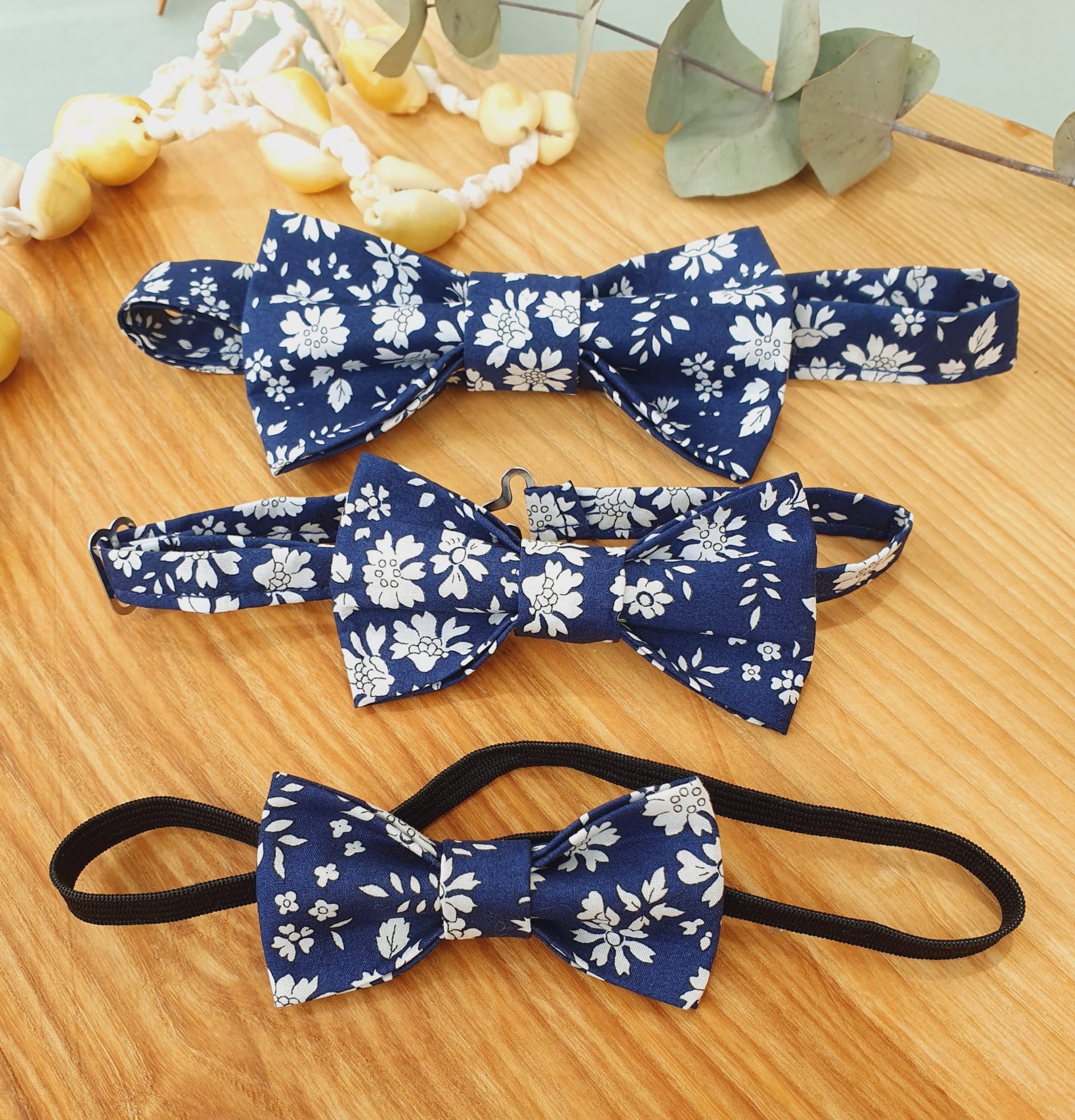 L’harmonie fait souvent la différence lors d’une cérémonie. C’est pourquoi je décline le motif Liberty Capel bleu marine pour toute la famille :