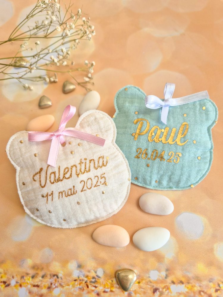 Parce que chaque détail compte pour annoncer la venue au monde de votre enfant, j’ai imaginé ce pochon à dragées ours comme un doudou de table.